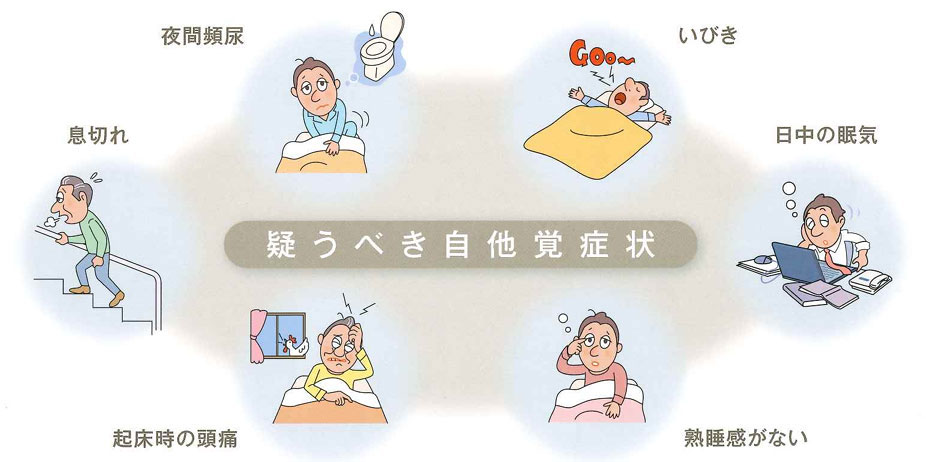 睡眠呼吸障害に伴う典型的な臨床症状としては、いびきや無呼吸、昼間の過剰な眠気、倦怠感、頻尿、頭痛等が挙げられますが、症状が乏しい、あるいは症状が全く無い場合も少なからずあることに注意が必要です。