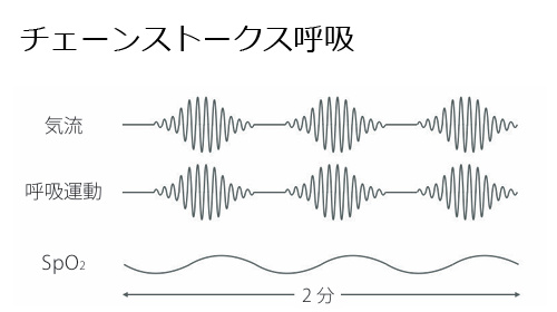 心不全・脳卒中疾患でみられることが多いチェーンストークス呼吸(Cheyne-Stokes breathing:CSB)はCSAの1種類です。
